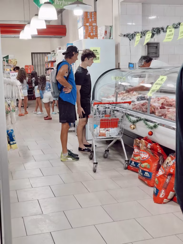 Una de las imágenes más comentadas lo muestra dentro de una carnicería del pueblo, junto a su padre, observando los cortes de carne con el changuito de compras al lado. Incluso el carnicero se sacó una foto con el piloto, que vestía ropa deportiva y alpargatas, en una escena cotidiana que sorprendió a los fanáticos.